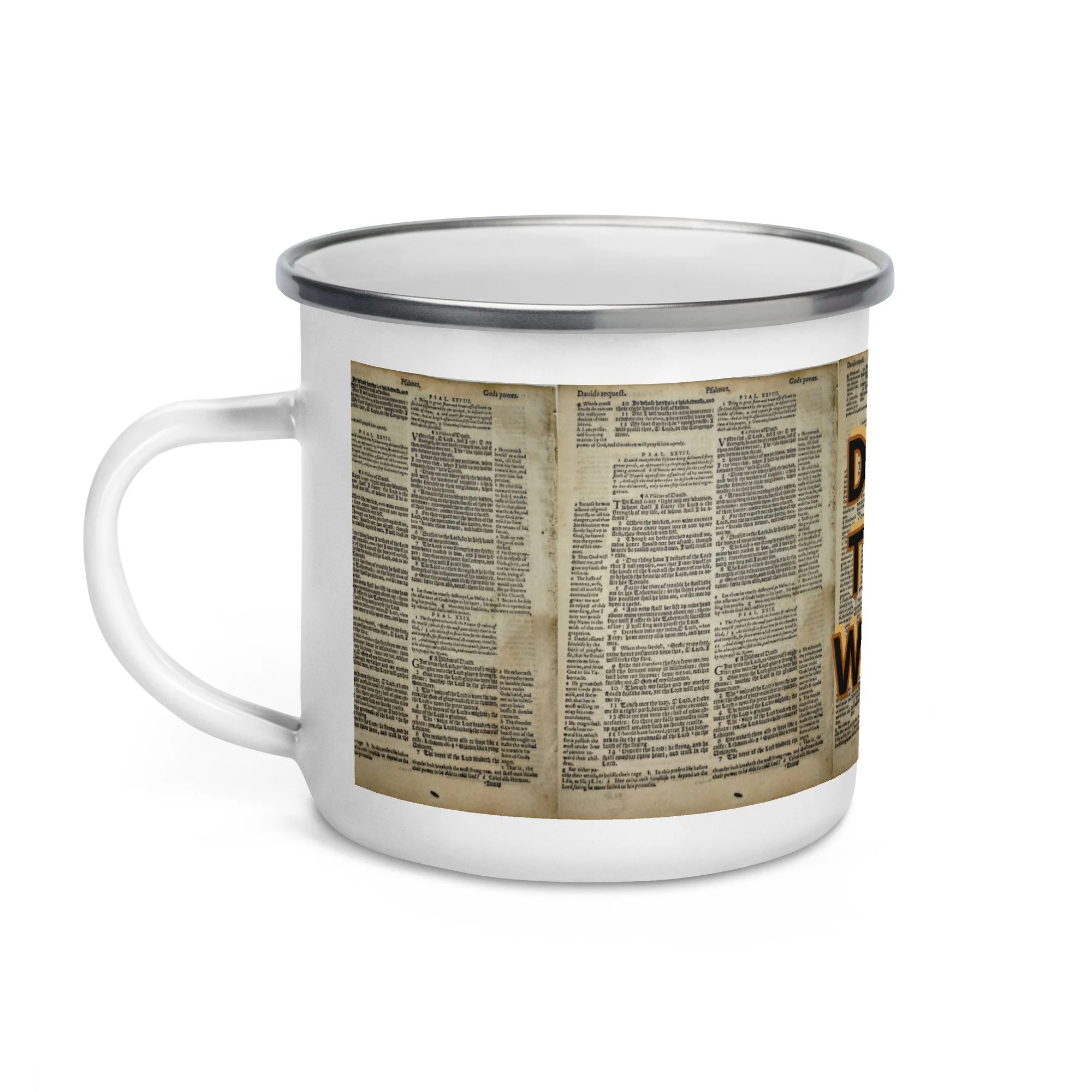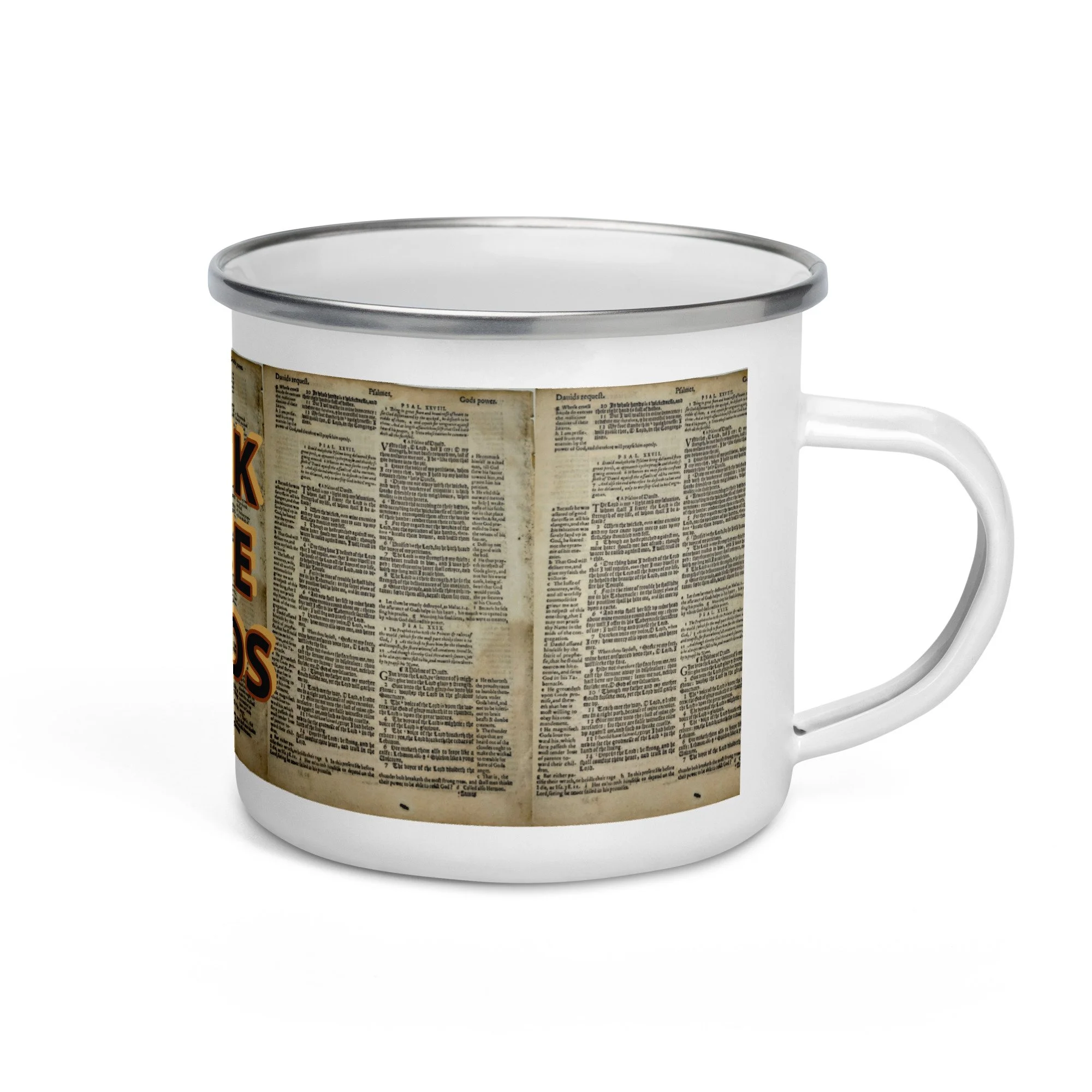 This design is made out of ancient Bible pages and comes with a great reminder, we should be drinking The Word every morning. Drink them with your eyes, pour them into your mouth and ears too. Saturate yourself in The Word as much as possible. It's fun.